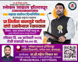 ज्ञानसेवा सोशल फाऊंडेशन संचालित ग्लोबल सायन्स इन्स्टिट्यूट, करमाळा (ता. करमाळा, जि. सोलापूर) यांचा सहावा वर्धापन दिन रविवार, दि. ४ जानेवारी २०२६ रोजी सकाळी १० वाजता विविध उपक्रमांनी उत्साहात साजरा होणार आहे. या वर्धापन दिनानिमित्त करमाळा शहरात प्रथमच सुप्रसिद्ध वक्ते मा. प्रा. नितीन बानगुडे पाटील यांचे “चला संस्कारी पिढी घडवू या… (आई-वडिलांचे महत्त्व समजून घेऊया…)” या विषयावर प्रेरणादायी व मार्गदर्शक व्याख्यान आयोजित करण्यात आले आहे अशी माहिती ग्लोबल सायन्स इन्स्टिट्यूट चे अध्यक्ष प्राध्यापक महेश निकष यांनी दिली आहे.