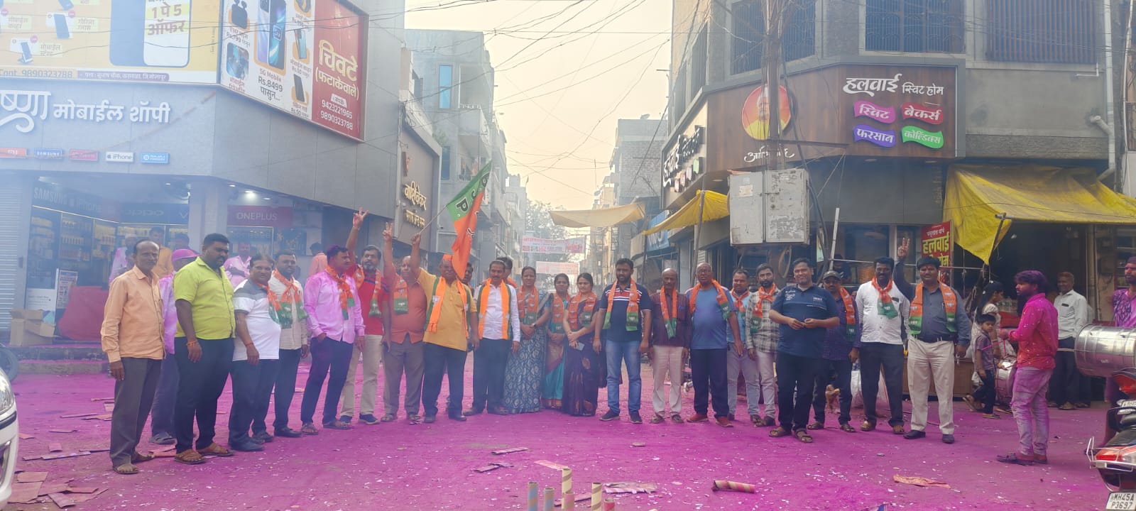 यावेळी भारतीय जनता पार्टीच्या वतीने ढोल ताशा, फटाके व पेढे वाटून गुलाल उधळून आनंद साजरा केला.