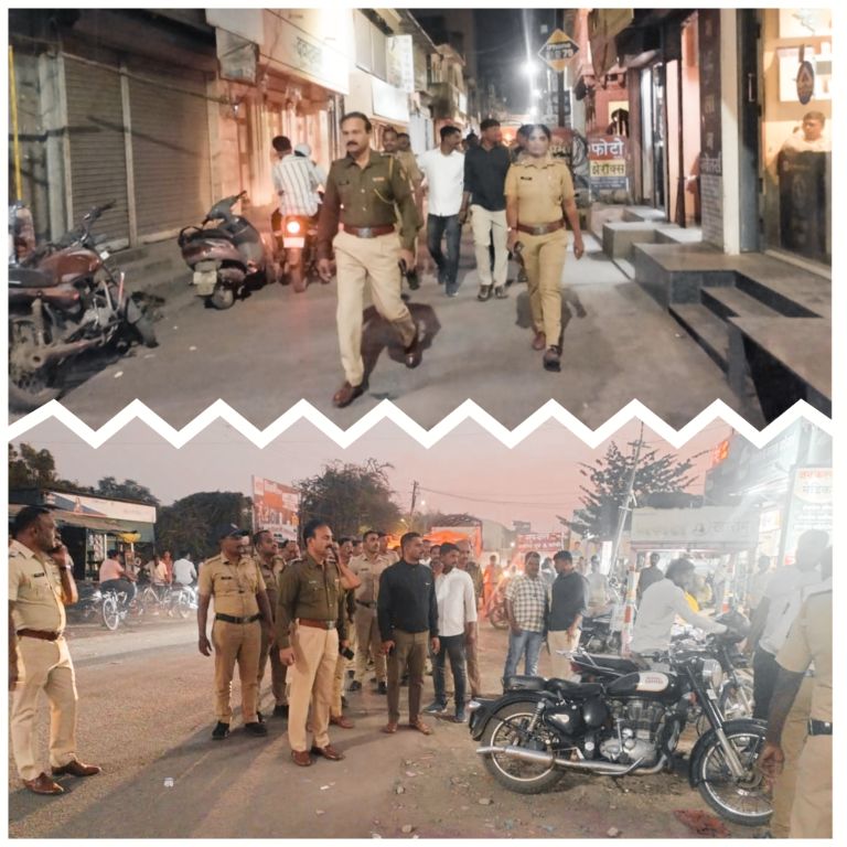 करमाळा प्रतिनिधी करमाळा शहरामध्ये कायदा सुव्यवस्था पालन करण्यासाठी कर्तव्यदक्ष पोलीस निरीक्षक विनोद घुगे साहेब यांच्या मार्गदर्शनाखाली पोलिस शांतता मार्च संप्पन झाला.करममाळा शहरामध्ये कायदा सुव्यवस्थेचे यशस्वी पालन करण्यासाठी नागरिकांनी दक्ष राहुन शहरामध्ये शांतता राहावी याकरिता पोलीस निरीक्षक विनोद घुगे साहेब यांच्या मार्गदर्शनाखाली करमाळा शहरातील मेन रोड ते महात्मा गांधी चौक याप्रमुख मार्गावरून बुधवार दिनांक 27 नोव्हेंबर रोजी सायंकाळी सात वाजता पोलिसांचा मार्च काढण्यात आला. मुलींची छेडछाड बंद व्हावी रोड रोमियोना शासन व्हावे रात्री अपरात्री चोरी ,गुन्हेगारीचे प्रमाण कमी व्हावे व बेकायदेशीर वाहनाची तपासणी करुन कायदा व्यवस्था राखण्याकरिता करमाळा शहरातून मार्च काढण्यात आला आहे. या मार्चमध्ये साहेब पीएसआय मदने साहेब यांनी सहभागी होऊन करमाळा शहरामध्ये शांतता मार्च द्वारे नागरिकांना दक्ष राहून गुन्हेगारी कमी करण्यासाठी व निर्भय जीवन जगण्यासाठी दक्ष राहून पोलिसांना सहकार्य करण्याचे आवाहन केले आहे.