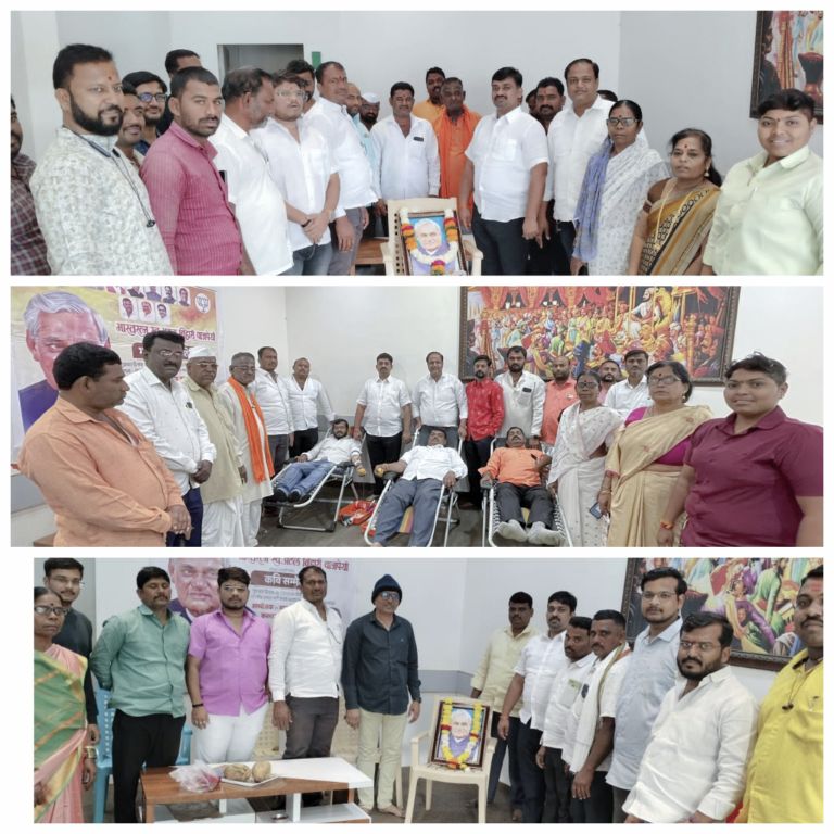 करमाळा प्रतिनिधी- भाजपा नेते,भारताचे माजी पंतप्रधान, भारतरत्न स्व.अटलबिहारी वाजपेयी यांची जयंती करमाळा भाजपाकडून विविध कार्यक्रमांनी साजरी करण्यात आली, यामध्ये देवळाली येथे नेत्ररोग निदान तपासणी शिबिर, करमाळा भाजपा संपर्क कार्यालय येथे भव्य रक्तदान शिबीर व काव्य संमेलन अशा विविध उपक्रमांनी दिवंगत नेते अटलजिंची जयंती साजरी करण्यात आली.