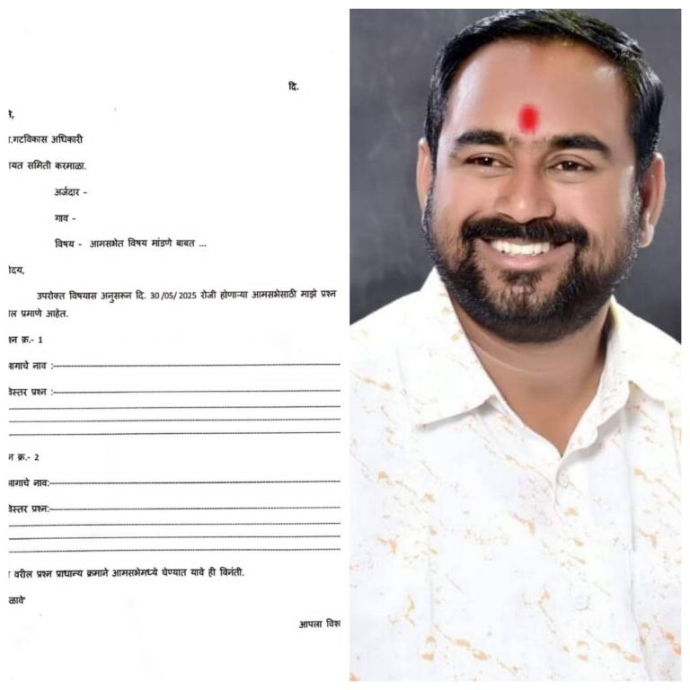 आमसभेचा प्रश्न उपस्थित करण्यासाठी अर्जाचा नमुना pdf पाटवत आहोत…तो प्रिंन्ट काढुन आपले रखडलेले प्रश्न भरून पंचायत समितीत द्यावे ;- संजय (बापु ) घोलप