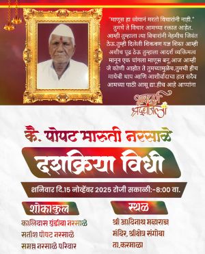 कै.पोपट मारुती नरसाळे यांचा दशक्रिया विधी शनिवार दिनांक 15 नोव्हेंबर रोजी संगोबा येथे संपन्न होणार