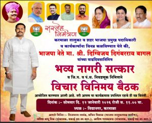 सोमवार, दि. १२ जानेवारी रोजी दिग्विजय बागल यांच्या नेतृत्वाखाली विचारविनिमय बैठक आयोजित करण्यात आली आहे. या बैठकीत आगामी जिल्हा परिषद व पंचायत समिती निवडणुकांची रणनीती ठरविण्यात येणार आहे. बैठकीस भारतीय जनता पार्टीचे पदाधिकारी, कार्यकर्ते तसेच बागल परिवाराचे समर्थक मोठ्या संख्येने उपस्थित राहणार असल्याचे सांगण्यात आले.