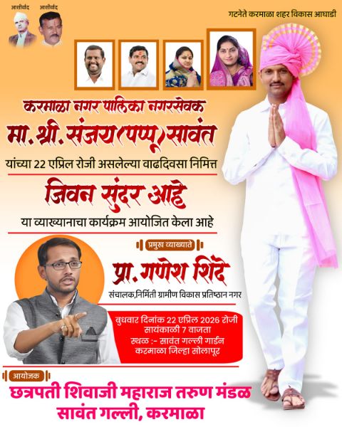 करमाळा प्रतिनिधी: करमाळा शहर विकास आघाडीचे गटनेते व नगरसेवक मा. श्री. संजय (पप्पू) सावंत यांच्या वाढदिवसानिमित्त छत्रपती शिवाजी महाराज तरुण मंडळाच्या वतीने एक प्रेरणादायी सामाजिक उपक्रम हाती घेण्यात आला असून, “जीवन सुंदर आहे” या विषयावर व्याख्यानाचे आयोजन करण्यात आले आहे.