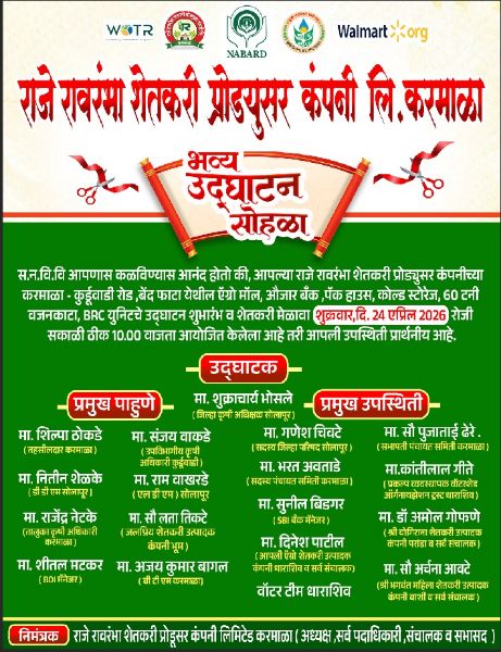 करमाळा तालुक्यातील कुईवाडी रोड, बेंद फाटा येथे आज राजे रावरंभा शेतकरी प्रोड्युसर कंपनी लिमिटेडच्या वतीने उभारण्यात आलेल्या विविध कृषी प्रकल्पांच्या भव्य उद्घाटन सोहळ्याचे आयोजन करण्यात आले आहे. सकाळी ठीक 10.00 वाजता हा कार्यक्रम होणार असून, यानिमित्ताने शेतकरी मेळावाही आयोजित करण्यात आला आहे.